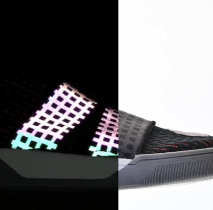 反光膜透過精密雷射切割作為商標使用,可貼合於織帶或百和緹花透明梭織布表面,應用於鞋面、外套等等產品。