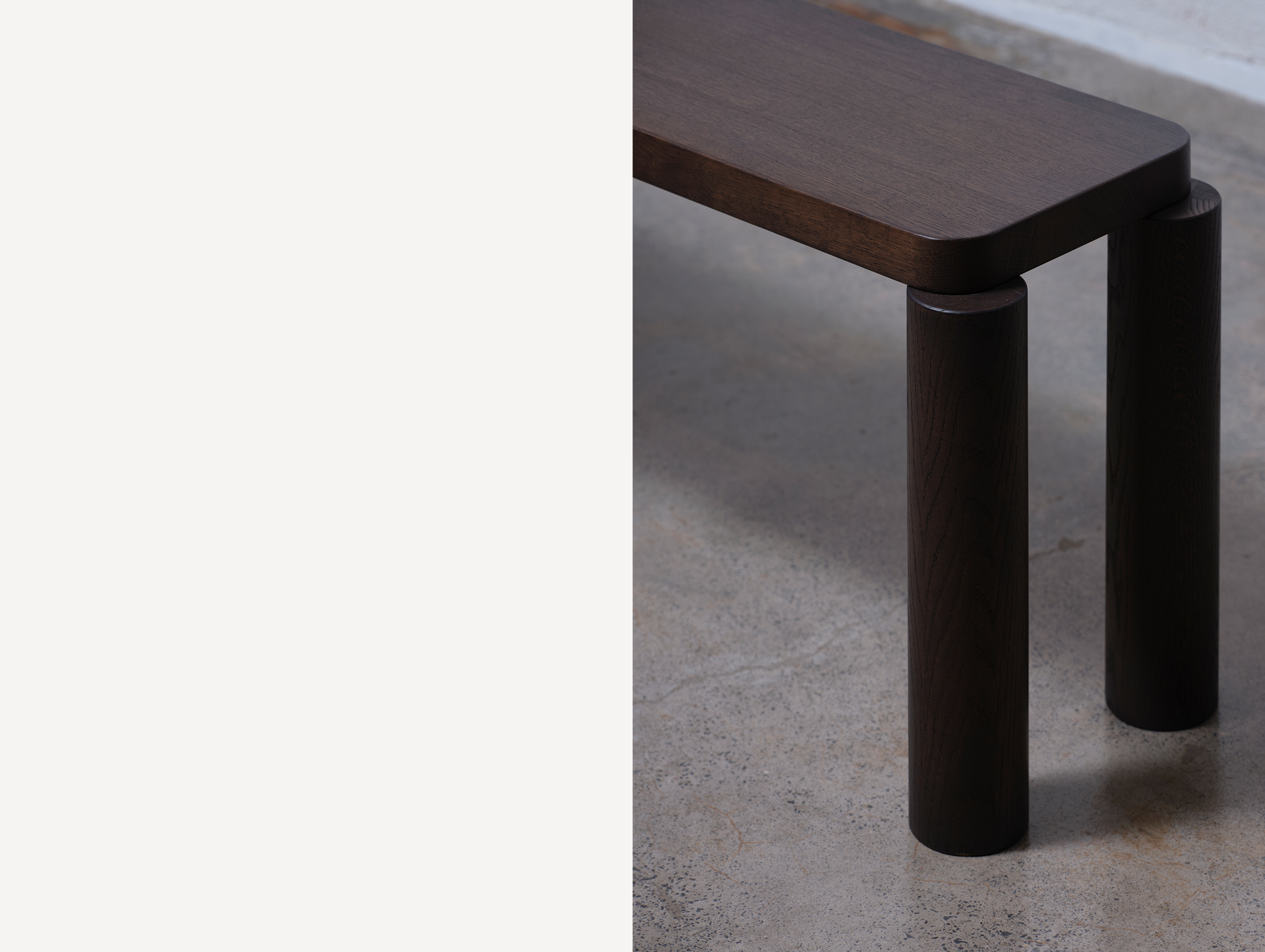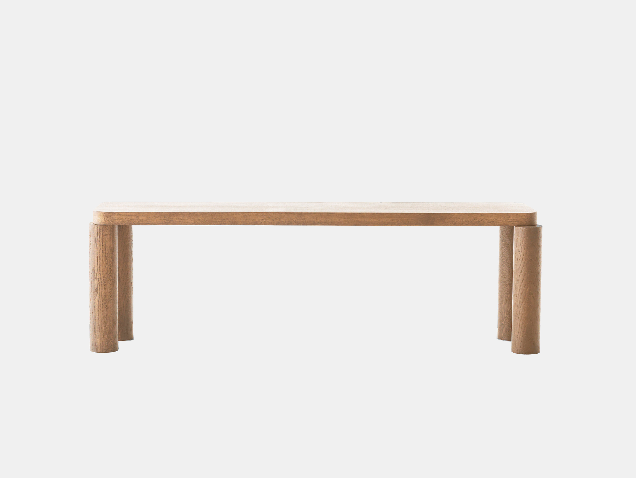 Made entirely of solid oak, the bench is defined by its distinctive legs, joined to the top by off-centre threaded connectors. Rounded corners and cylindrical legs complement the bench's generous dimensions, creating a sense of warmth and fun.